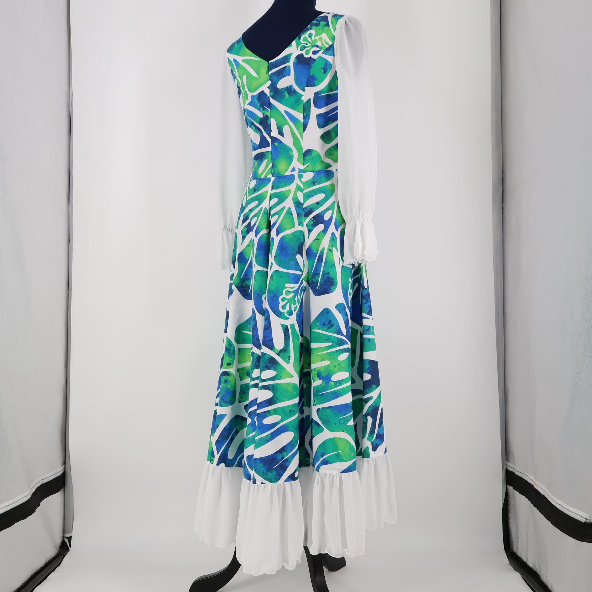 #フラダンス #ワンピースドレス #ハイビスカス柄 #モンステラ柄 #グリーン #ブルー #ホワイト #青 #白 #緑 #花柄 #華やか #フラ衣装 #フラガール #リゾートコーデ #アロハファッション #タヒチアン #ダンス衣装 #ダンスコスチューム #ステージ衣装 #古着 #中古 #ENUTSU
