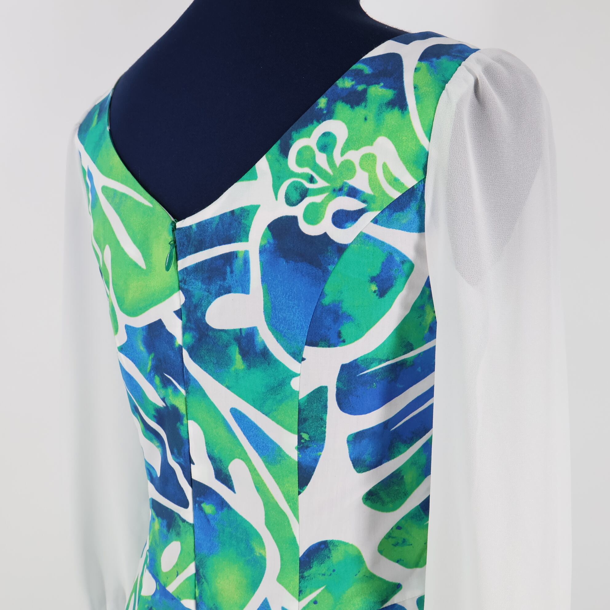 【美品 日本製 フラダンス衣装】グリーン Paondor パンドール ワンピース ドレス 白 青 緑 ハイビスカス柄 モンステラ柄 花柄