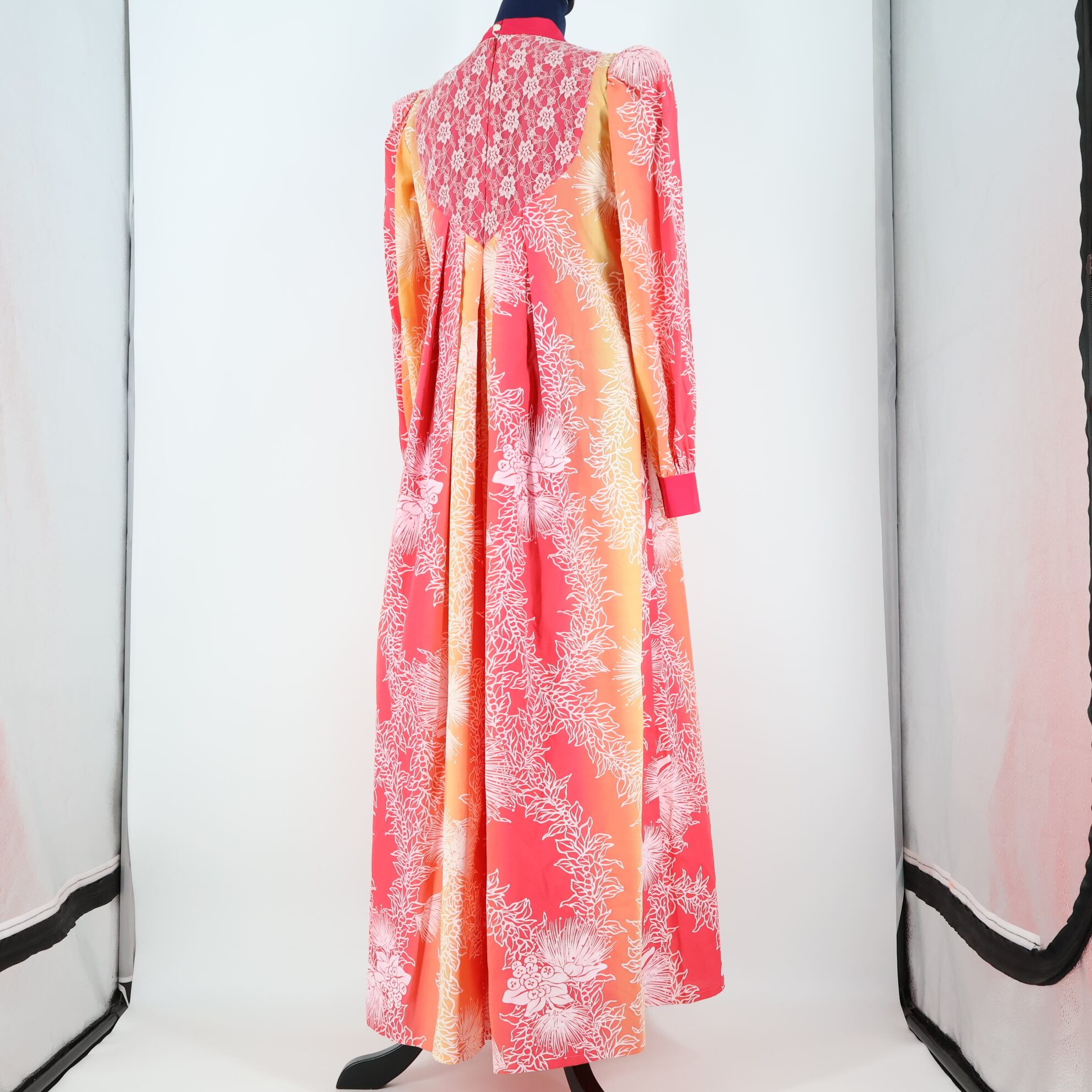 #フラダンス #ワンピースドレス #レフア柄 #マイレ柄 #花柄 #オレンジ #グラデーション #レース #長袖 #可愛い #フラガール #リゾートコーデ #アロハファッション #南国スタイル #フラ衣装 #ダンス衣装 #ダンスコスチューム #ステージ衣装 #古着 #中古 #ENUTSU