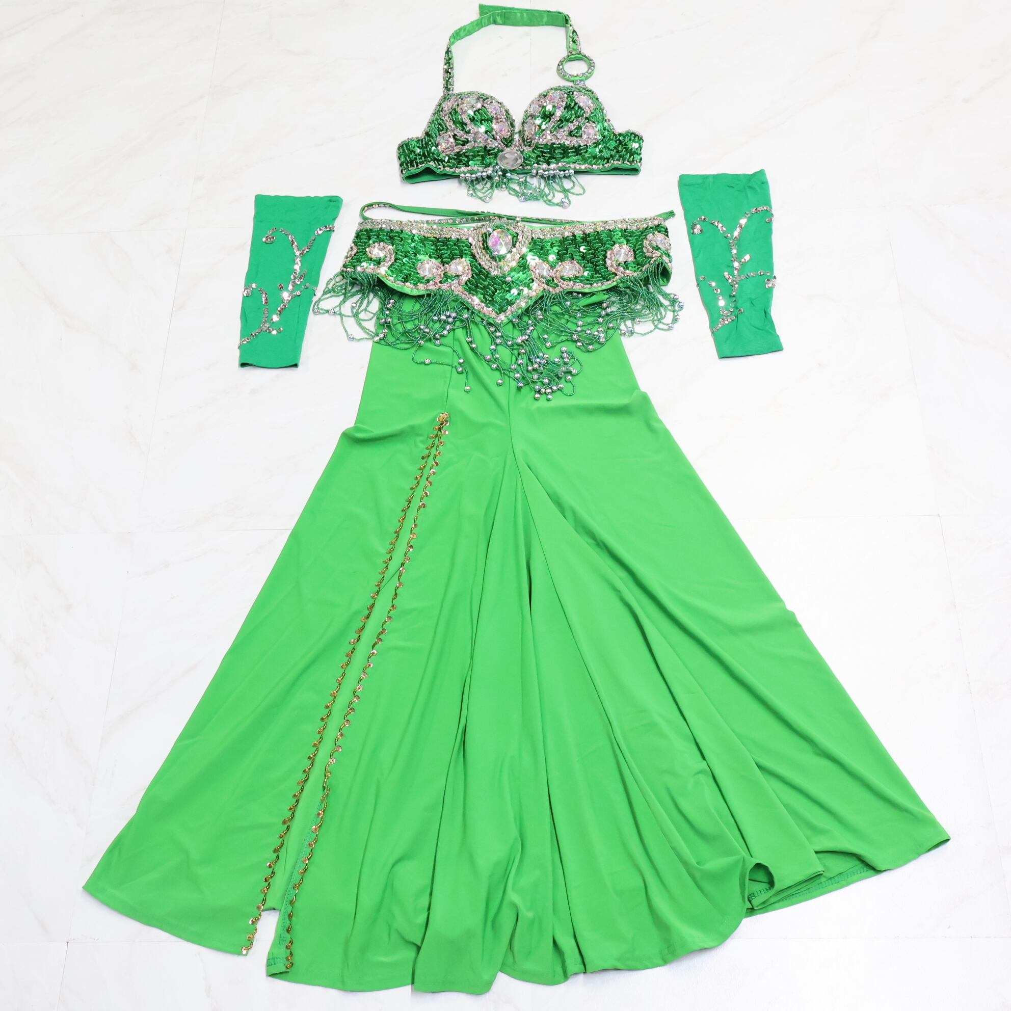 #ベリーダンス #オリエンタル衣装 #グリーン #Qiaoshi #ラメ豪華 #緑 #シルバー #爽やか #鮮やか #綺麗 #ストレッチ素材 #輝き #明るい #煌びやか #トップス #スカート #ベルト #アクセサリー #ダンス衣装 #ダンスコスチューム #ステージ衣装 #古着 #中古 #ENUTSU