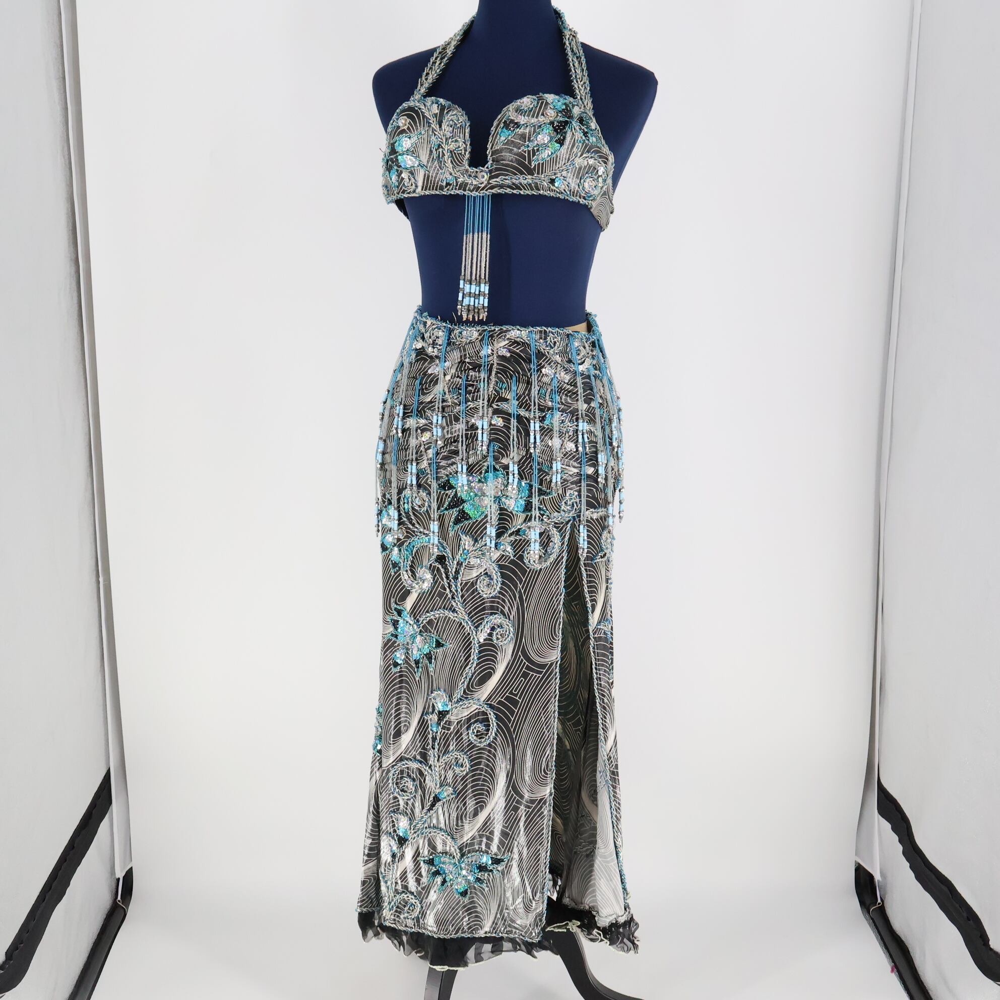 【ベリーダンス用 オリエンタル衣装】ブラック×ホワイト×水色 ビーズ 豪華 ラメ 黒 白 シルバー 光沢 綺麗 スリット 輝き ラインストーン スパンコールラメ 大人っぽい フリル レース トップス スカート アクセサリー セット