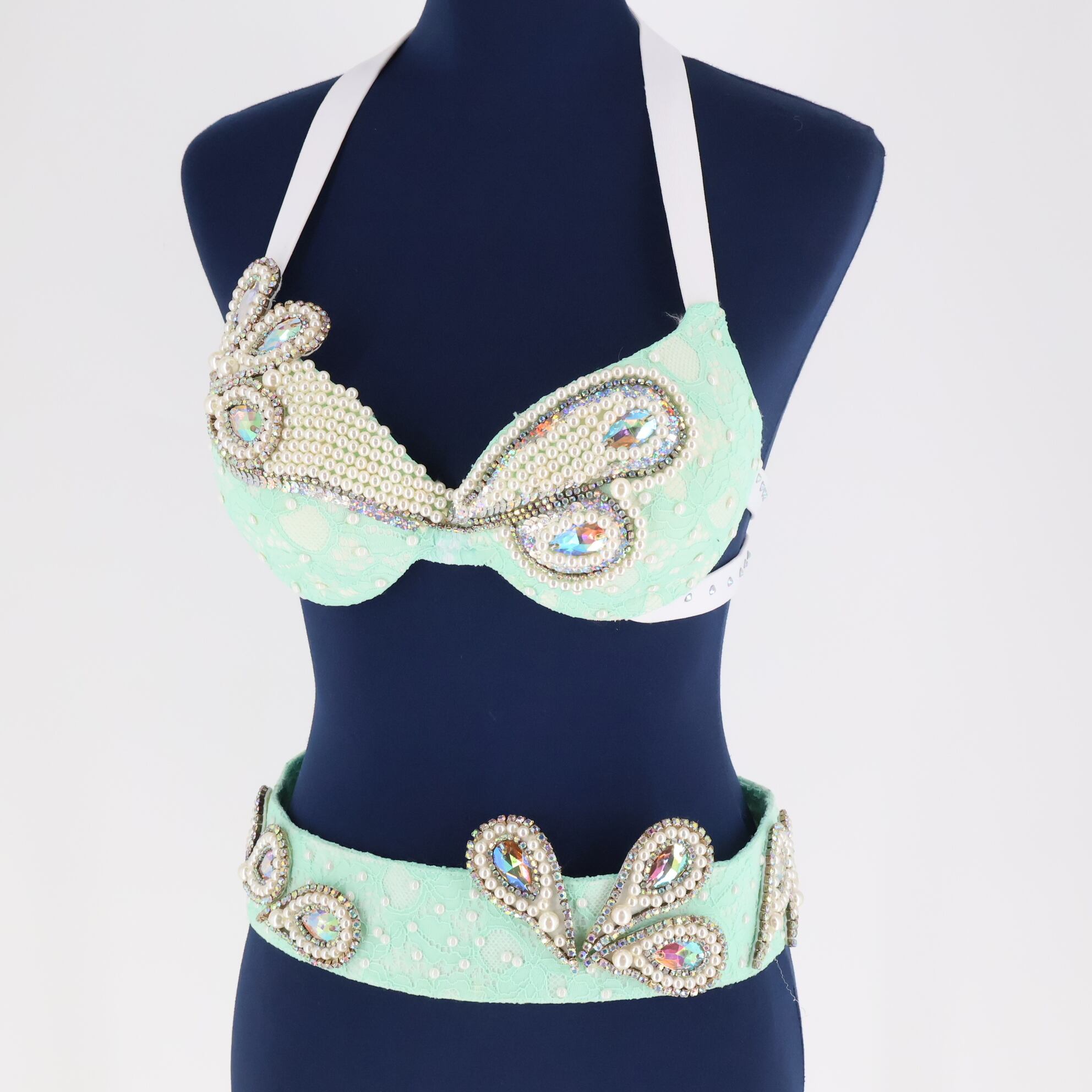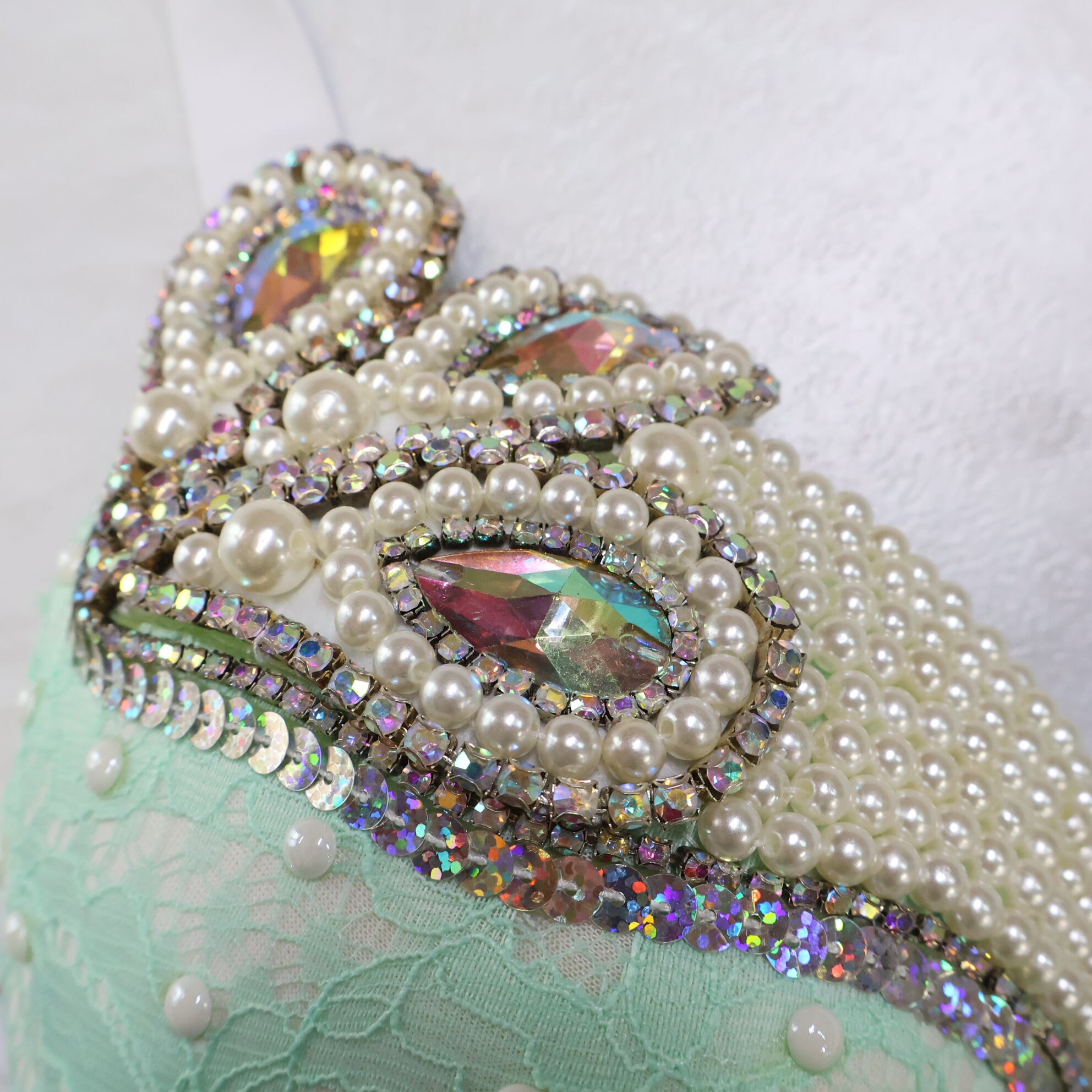 #ベリーダンス #オリエンタル衣装 #ライトグリーン #Qiaoshi #ラインストーン #パール #ビーズ #豪華 #緑 #パステルカラー #爽やか #可愛い #ふんわり感 #スパンコールラメ #シルバー #トップス #ベルト #ダンス衣装 #ダンスコスチューム #ステージ衣装 #古着 #中古 #ENUTSU