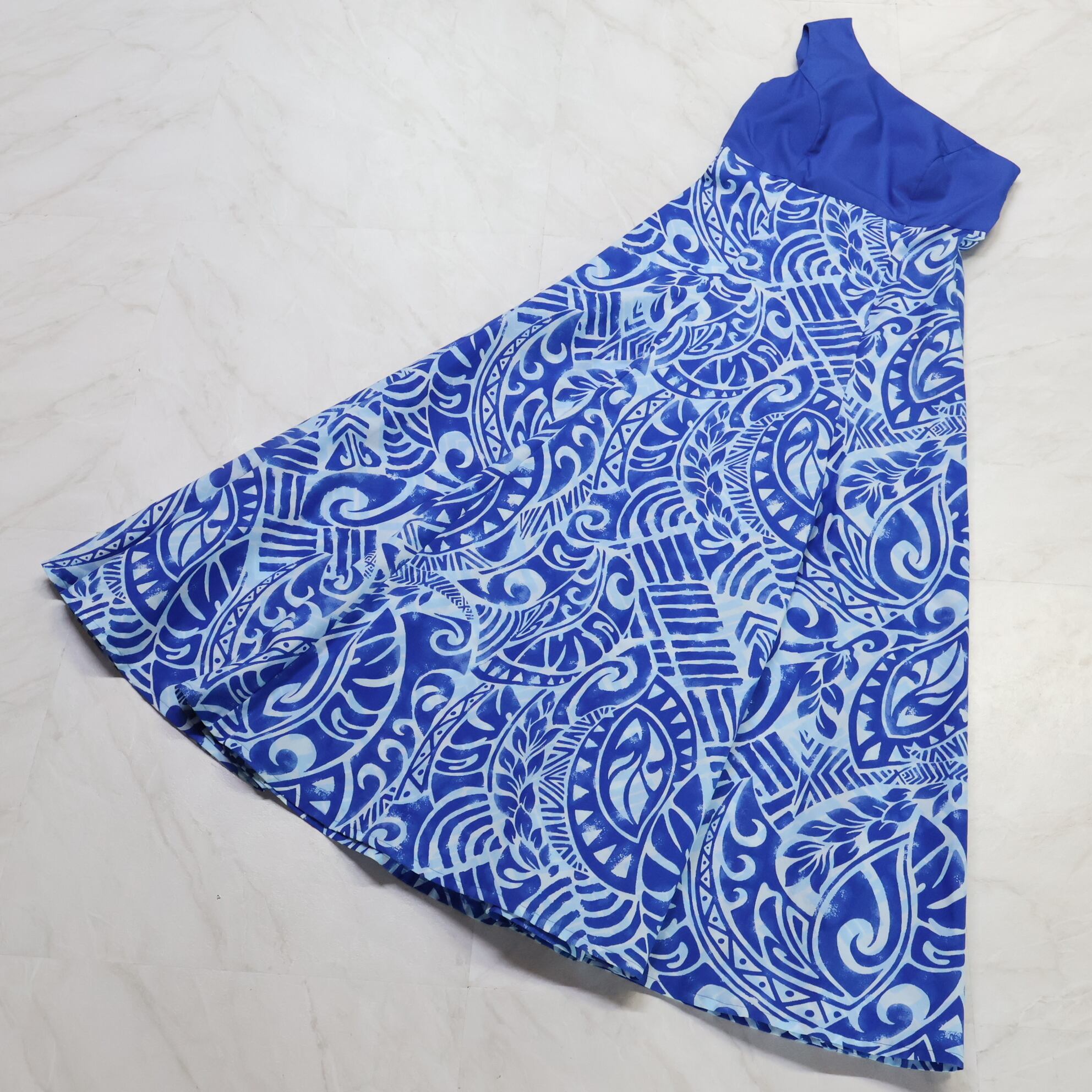 【美品 日本製 フラダンス衣装】ブルー EKOLU EHIKU エコルエヒク ワンピース ドレス 青 水色 ワンショルダー アロハ かわいい