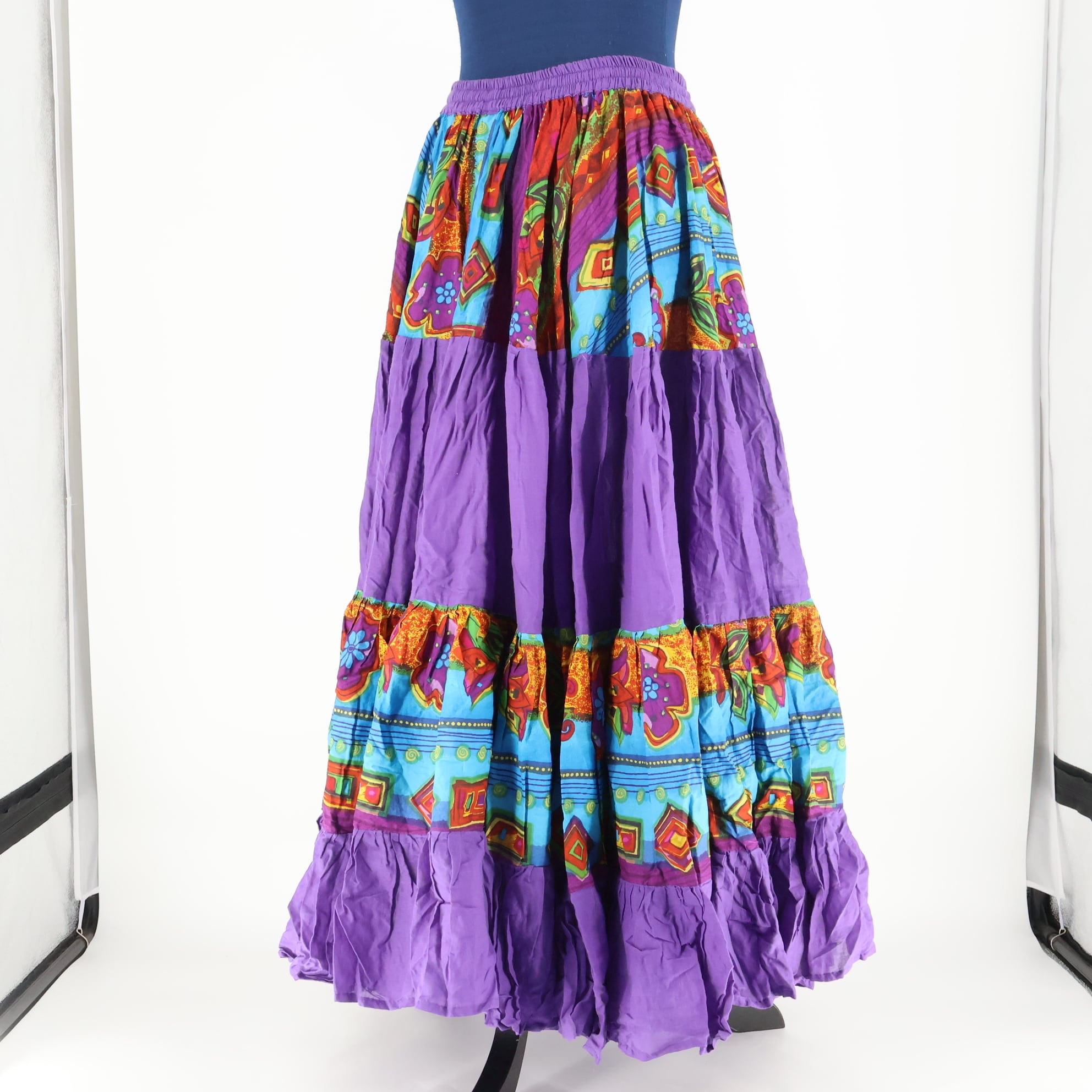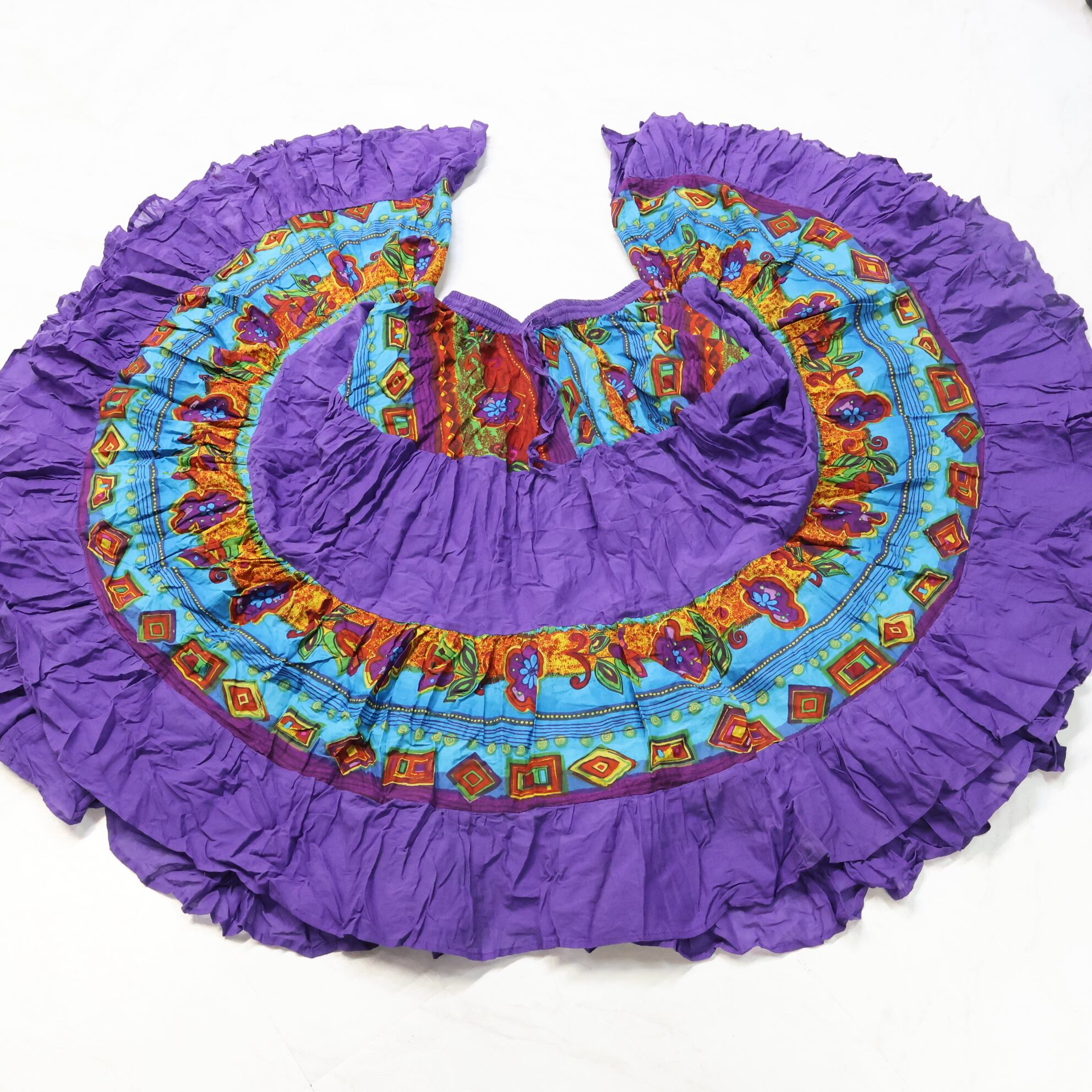 【インド製 ベリーダンス用衣装】パープル×水色×オレンジ MYST ボリューム ジプシースカート 紫 フリル 異国情緒 鮮やか 柄 ロング 大きく広がる裾 華やか