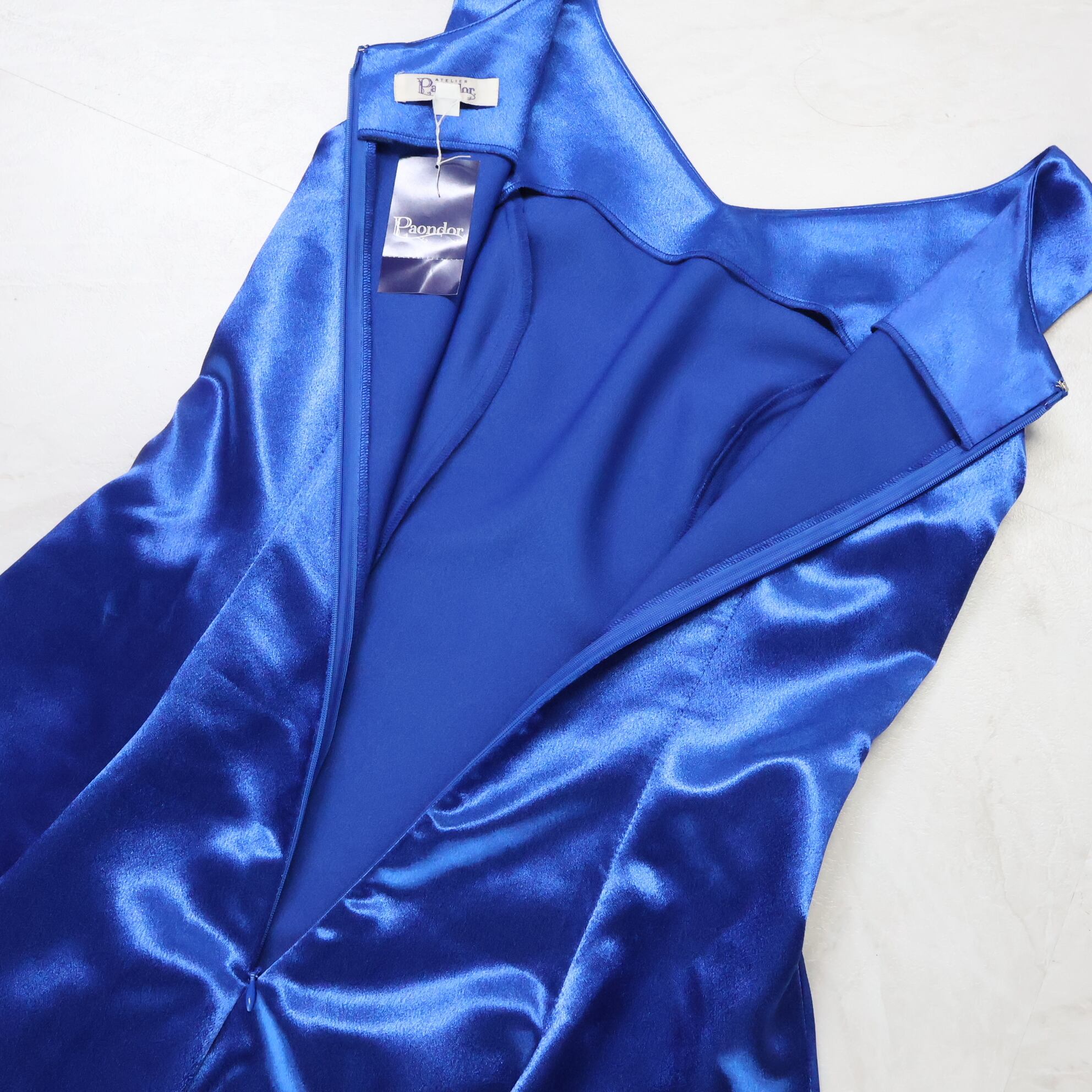 【日本製 フラダンス衣装】ブルー Paondor パンドール ワンピース ドレス 青 サテン 無地 シンプル 光沢 高級感 ノースリーブ